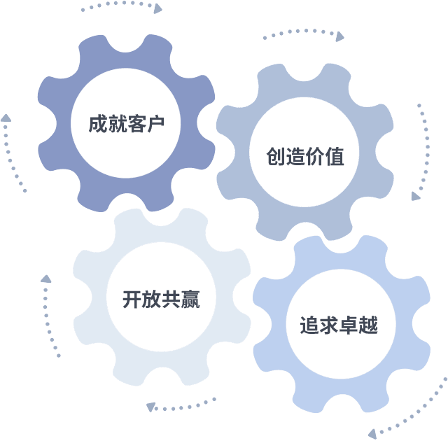 成就客户是一切决策的出发点,,创造价值是衡量所有工作的标准,,,,追求卓越是我们做事做人的态度,,,开放共赢是我们的格局也是最终的结果。。。。价值观的齿轮环环相扣,,推动着组织里的每个人不断向前。。